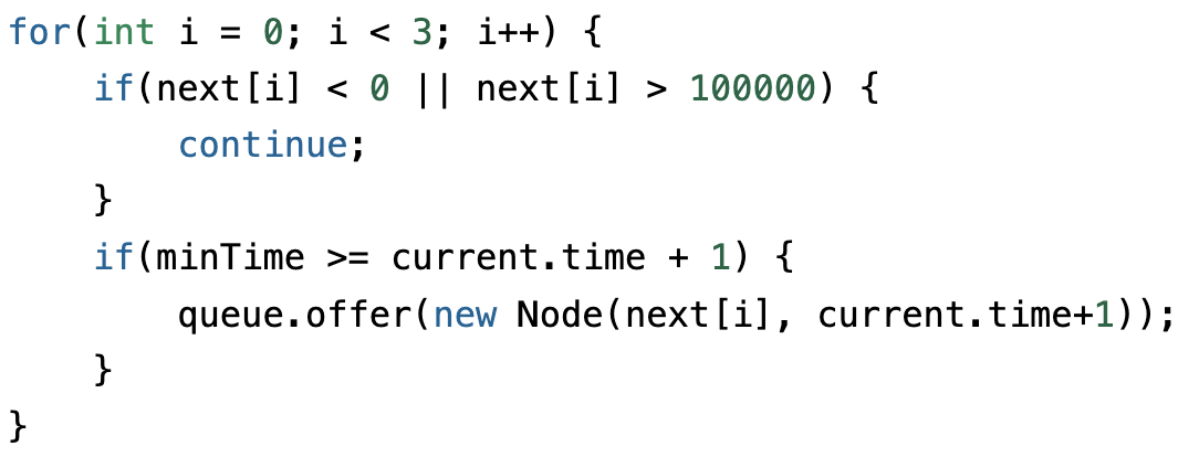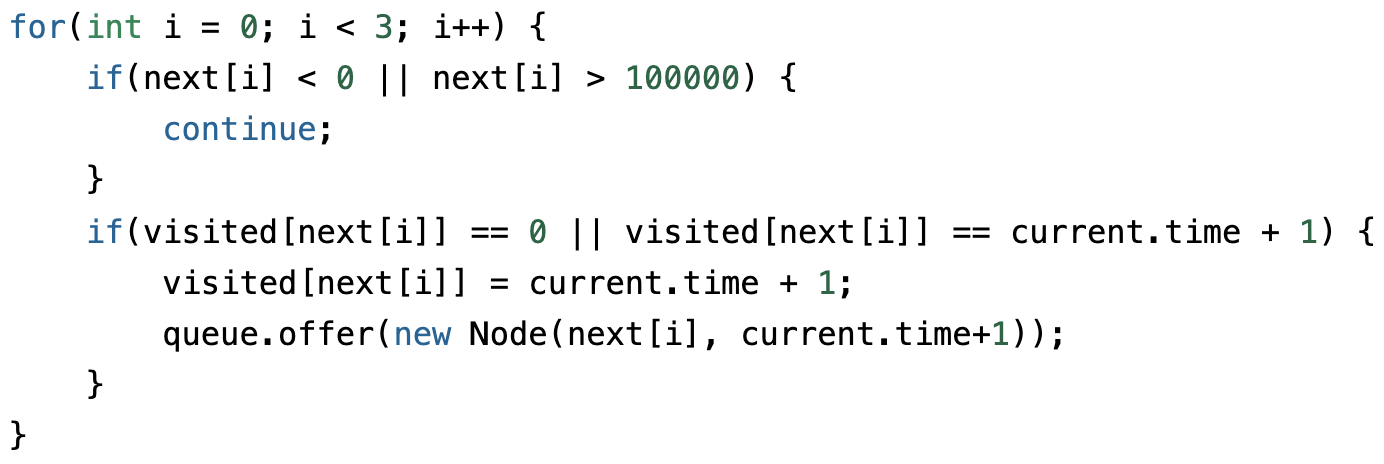 if(visited[next[i]] == 0 || visited[next[i]] == current.time + 1) {