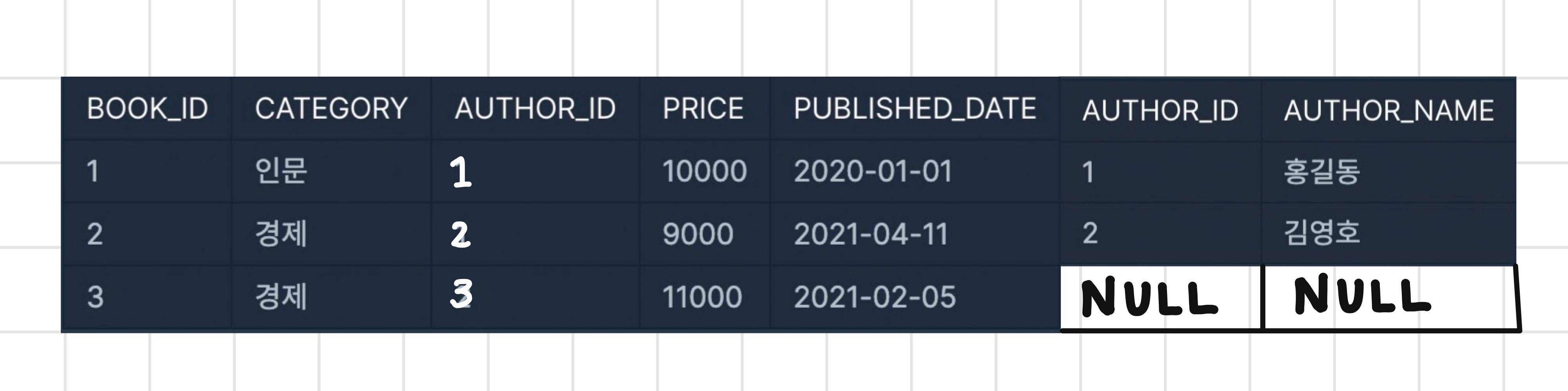 - LEFT : 왼쪽 테이블을 기준으로 오른쪽 테이블을 매칭, 없는 경우 NULL로 표시