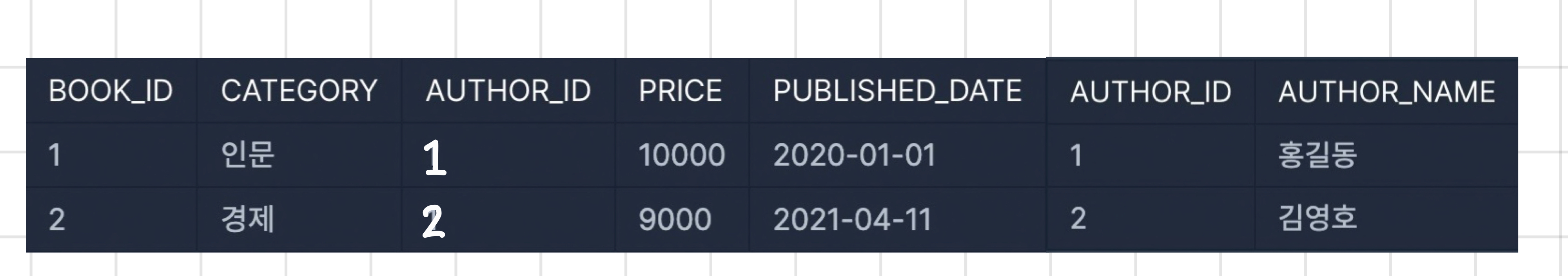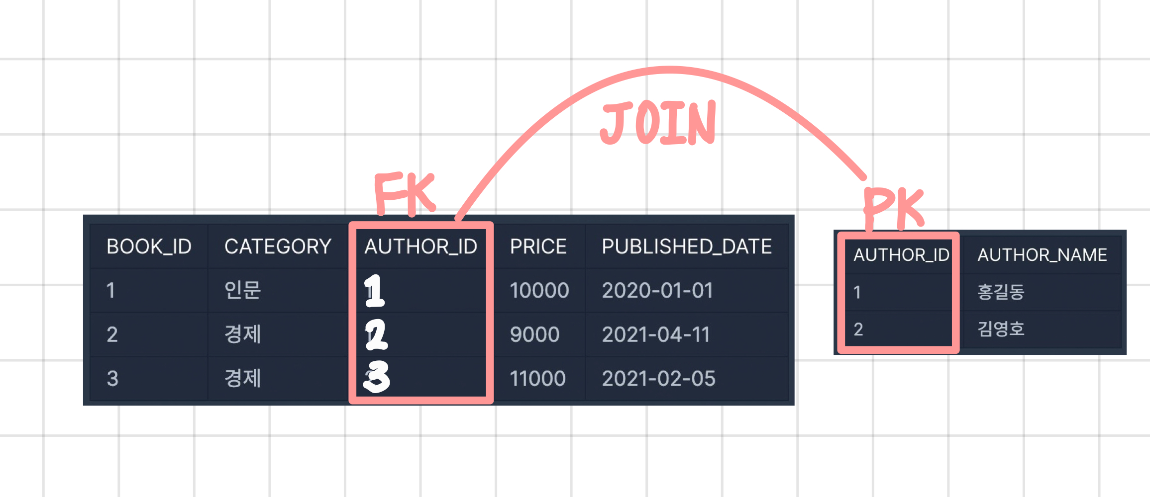 외래키(Foreign Key)와 기본키(Primary Key)를 사용하여 두 테이블을 연결한다.