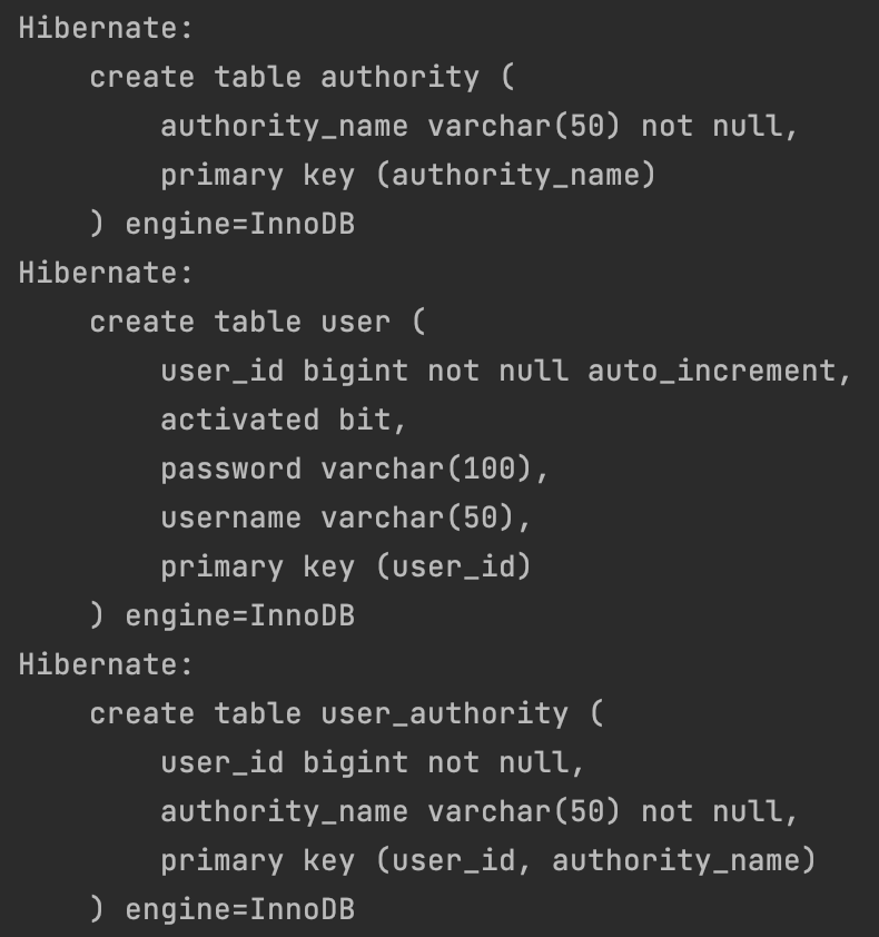 처음에는 실행해도 테이블이 생성이 되지 않아 다른 자료를 참고하다가 추가해주어야 하는 정보를 찾았다.
