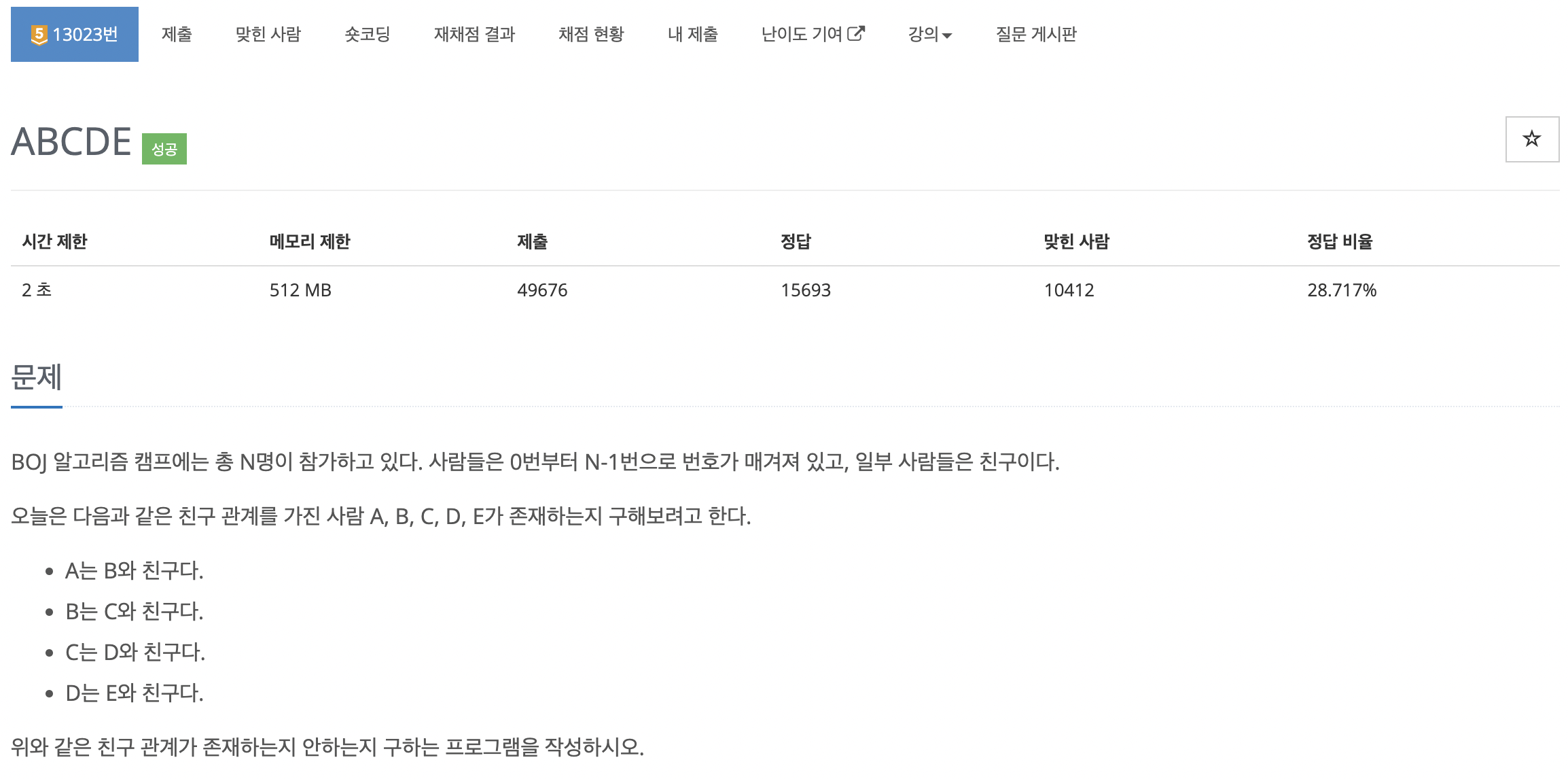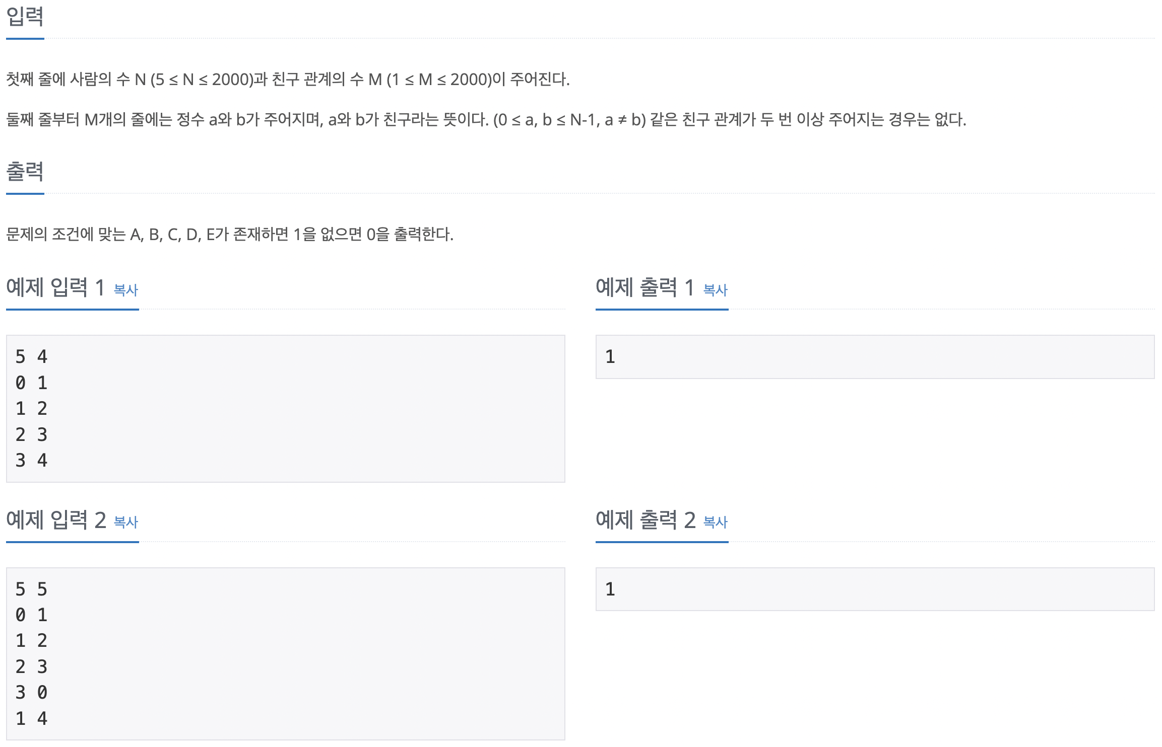 ์ค๋์ ๋ค์๊ณผ ๊ฐ์ ์น๊ตฌ ๊ด๊ณ๋ฅผ ๊ฐ์ง ์ฌ๋ A, B, C, D, E๊ฐ ์กด์ฌํ๋์ง ๊ตฌํด๋ณด๋ ค๊ณ ํ๋ค.