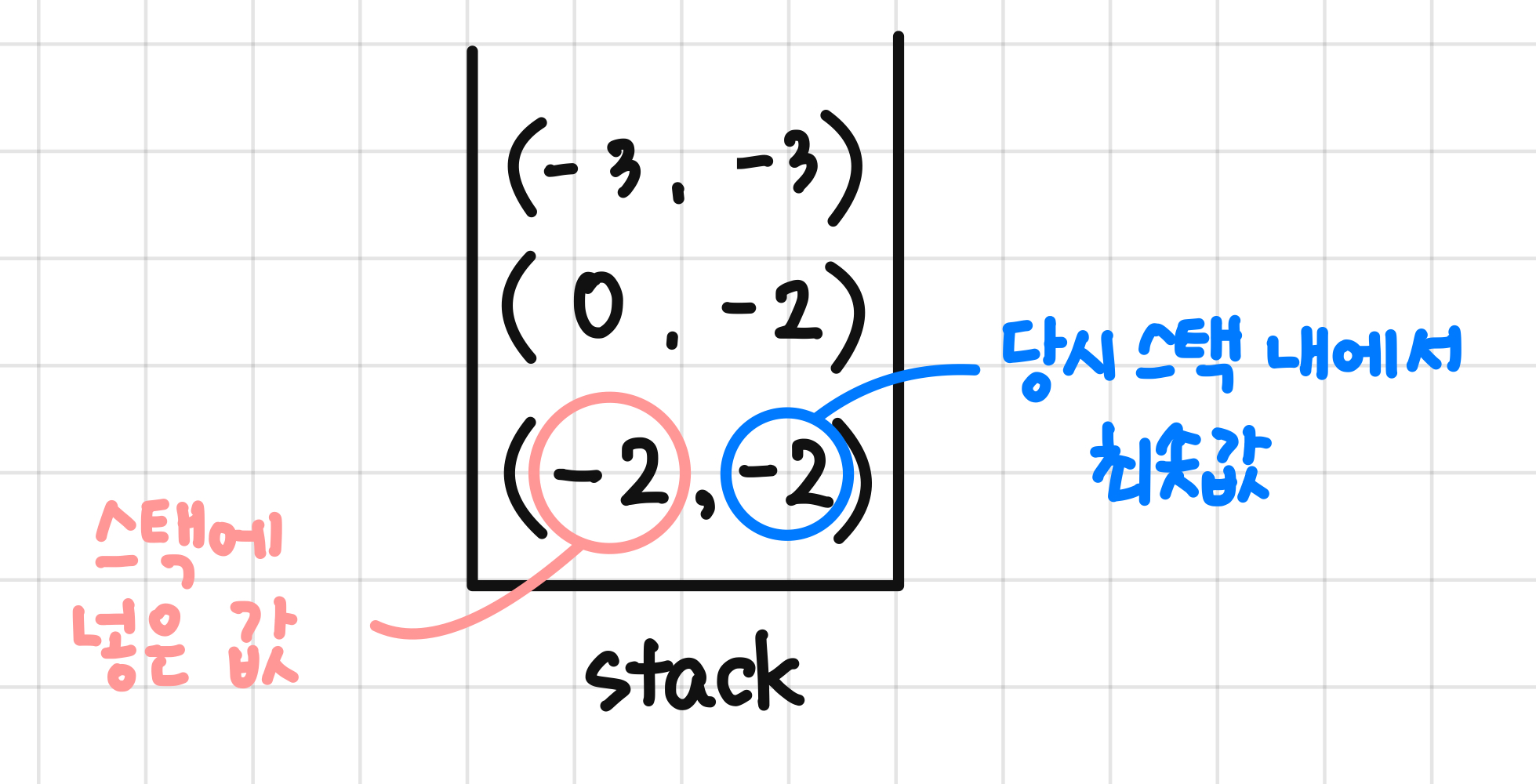 아래의 그림과 같이 (현재값, 당시 최솟값)을 요소로 가지는 스택으로 구현했다.
