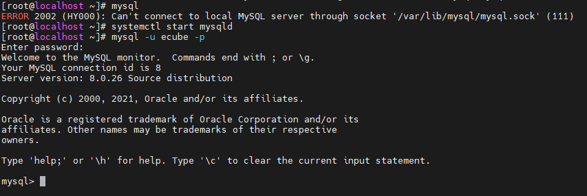 ERROR 2002 (HY000): Can't connect to local MySQL server through socket '/var/lib/mysql/mysql.sock' (111)