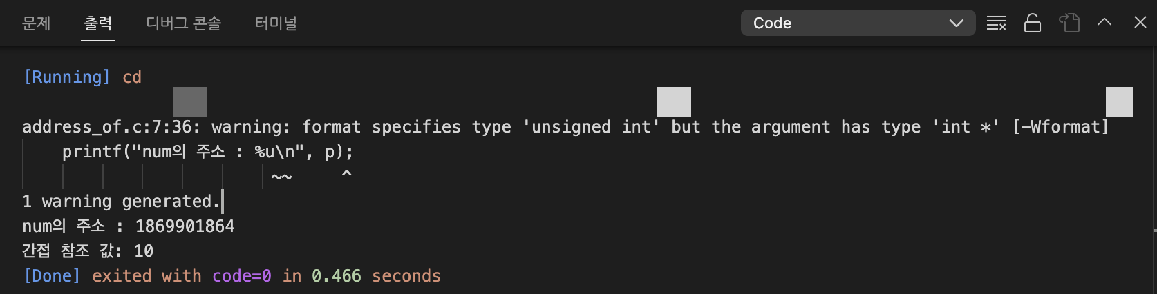 printf("간접 참조 값: %d", *p);