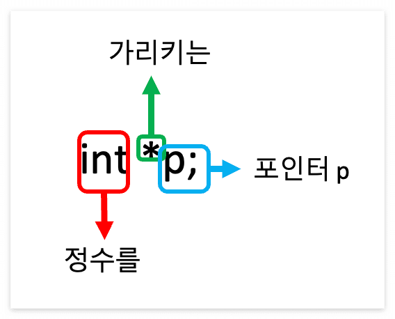 ★ 포인터를 선언할 때 int *p; 또는 int* p; 라고 쓸 수 있다. 일반적으로 전자와 같은 방법을 사용한다.