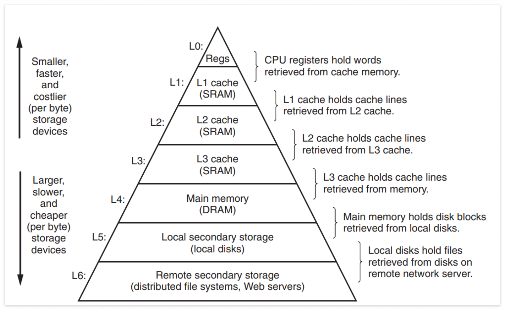 메모리 계층 구조의 주요 아이디어는 즉, 한 레벨의 저장장치가 다음 하위 레벨 저장장치의 캐시 역할을 한다는 것이다.
