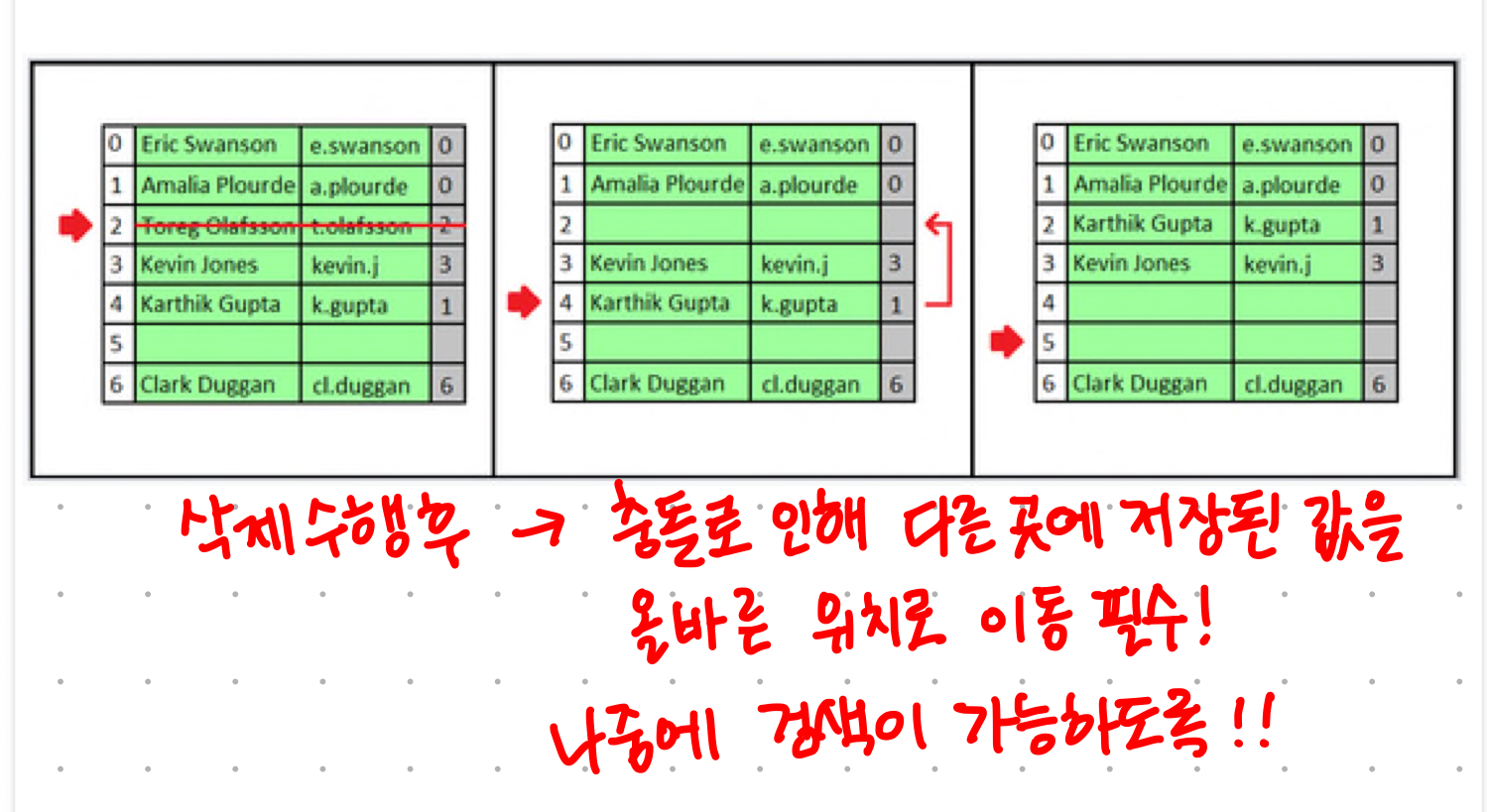 충돌이 발생하면 주위의 빈칸을 찾아서(대체 위치 탐색) 값 삽입