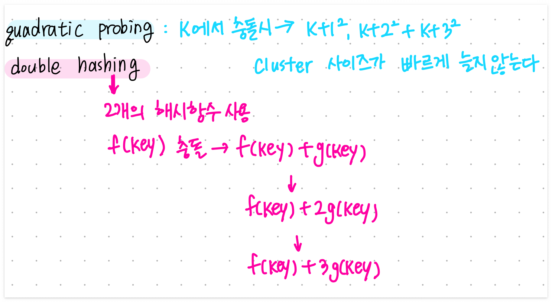 - double hashing : 2개의 해시함수를 사용하여 보조 해시함수만큼 증가하며 빈칸 탐색