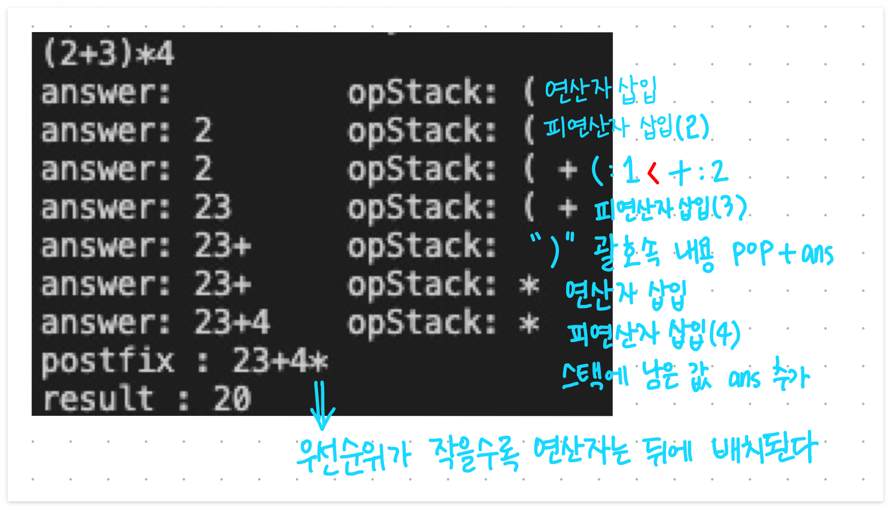 - 연산자 : 스택에서 pop()을 2번 실행하여 얻어진 피연산자를 이용해 연산 실행 → 연산 결과 스택에 push