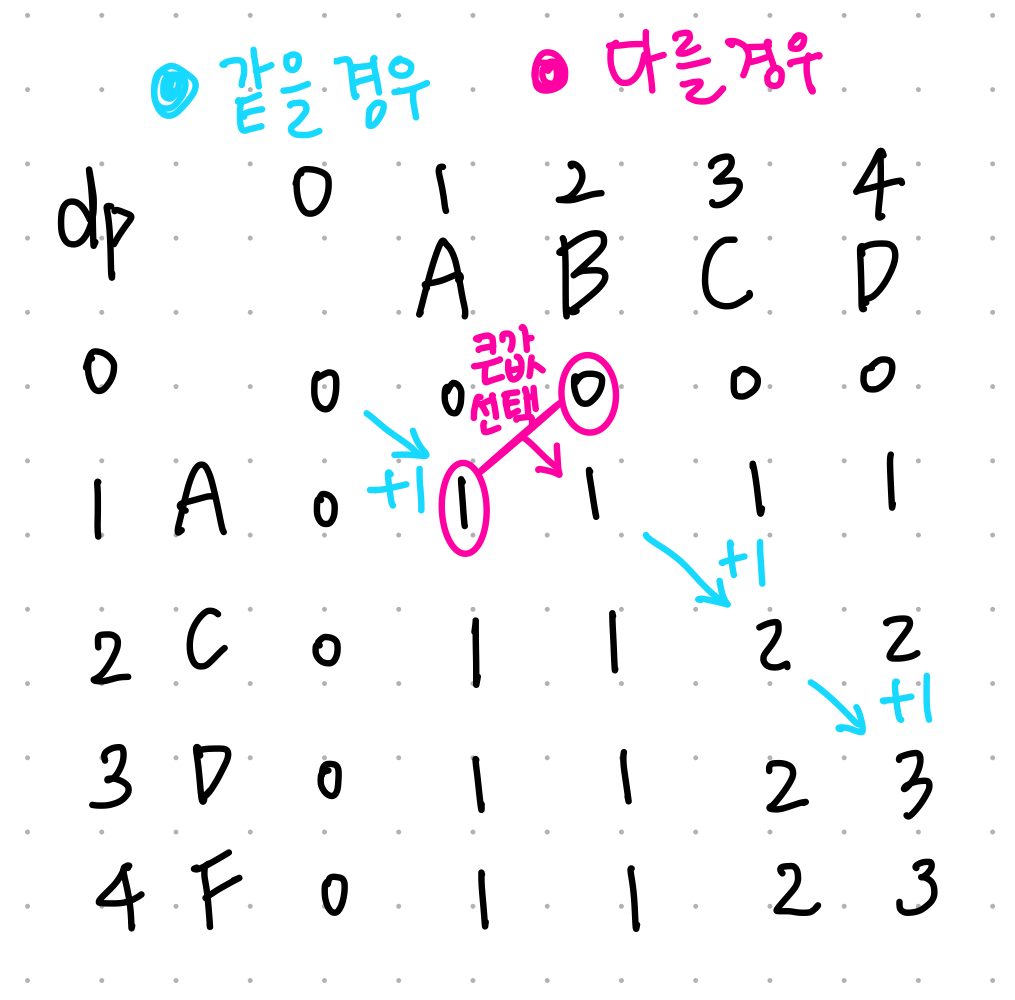 if x[i-1] == y[j-1] : # 두 문자가 같을 경우