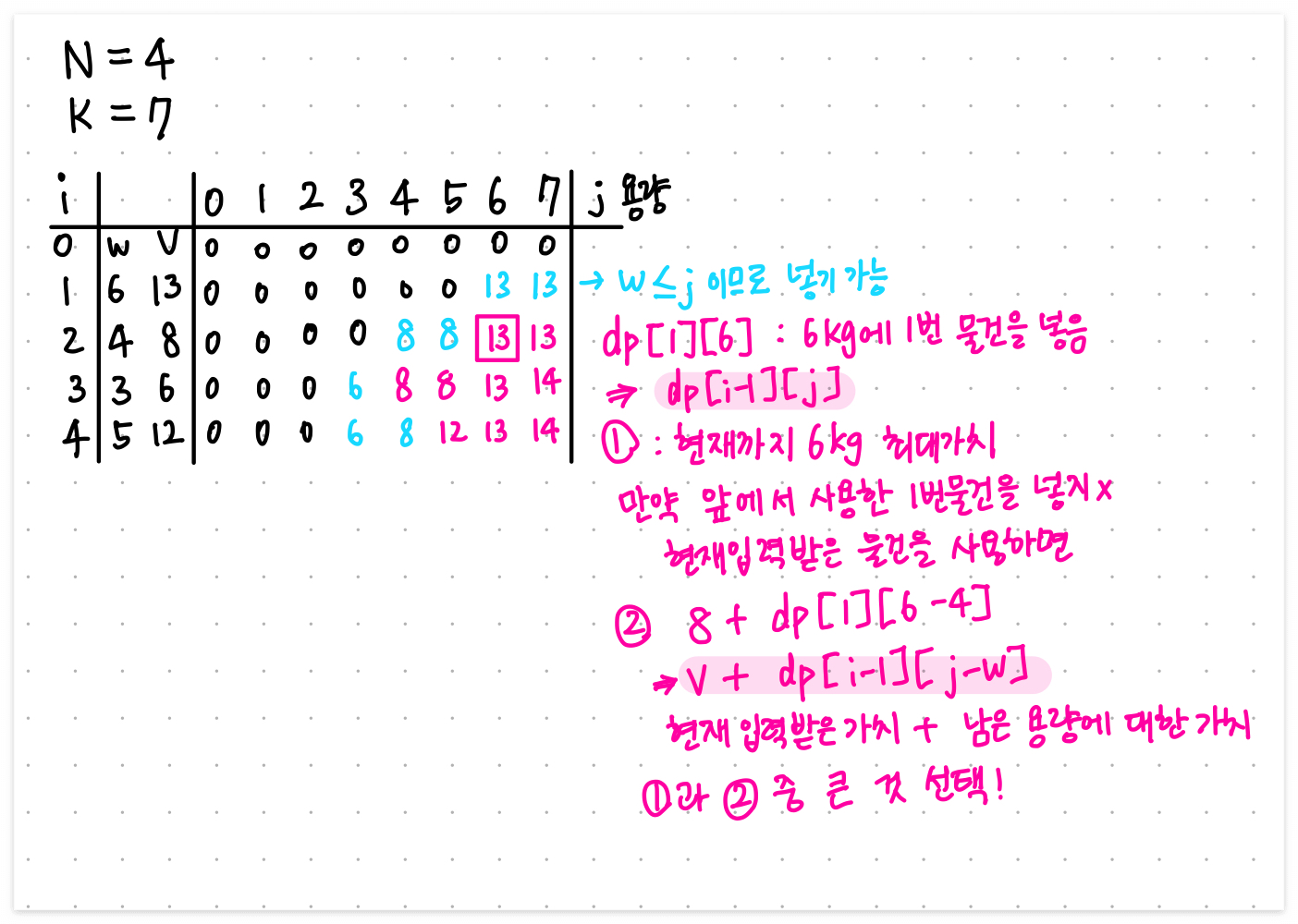 # 2. 현재 물건을 넣고 나머지 용량에 대한 가치를 더한 경우