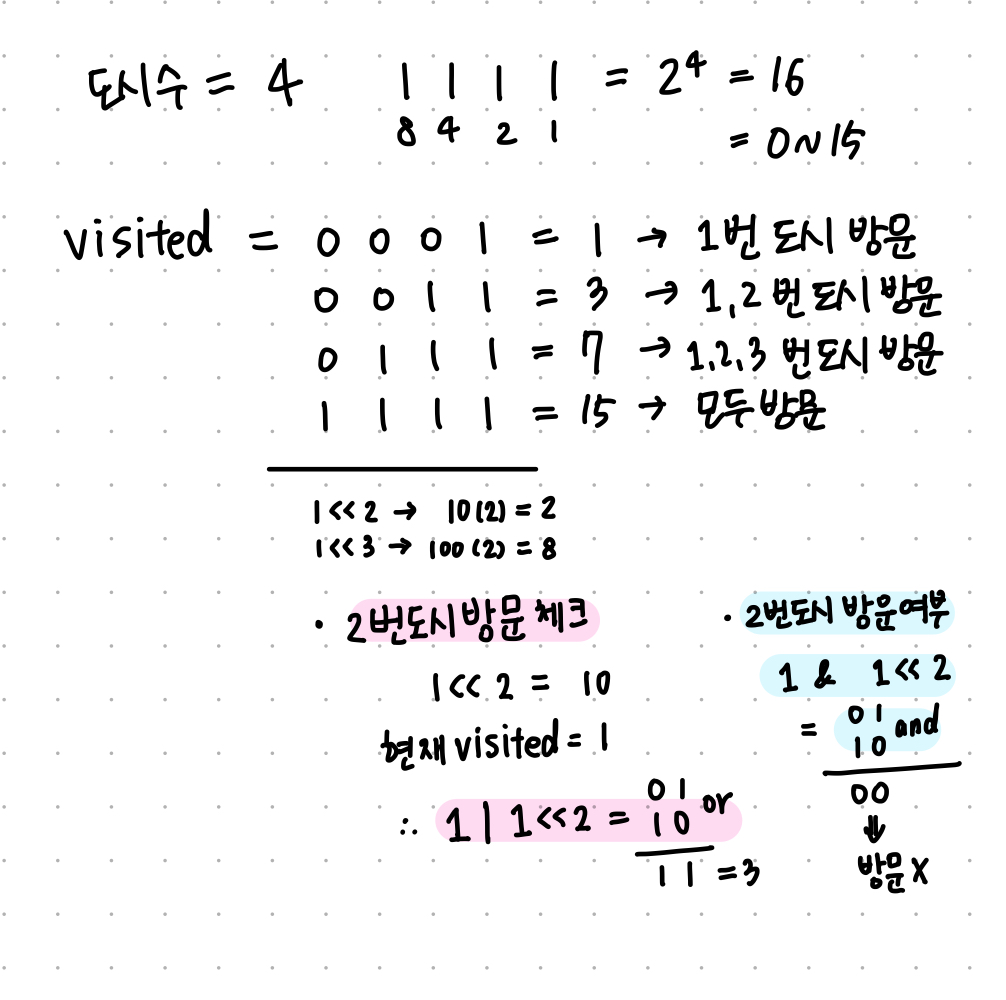 : visited | (1 << i) → i번째 자리리만 1로 설정한뒤 or 연산 실행