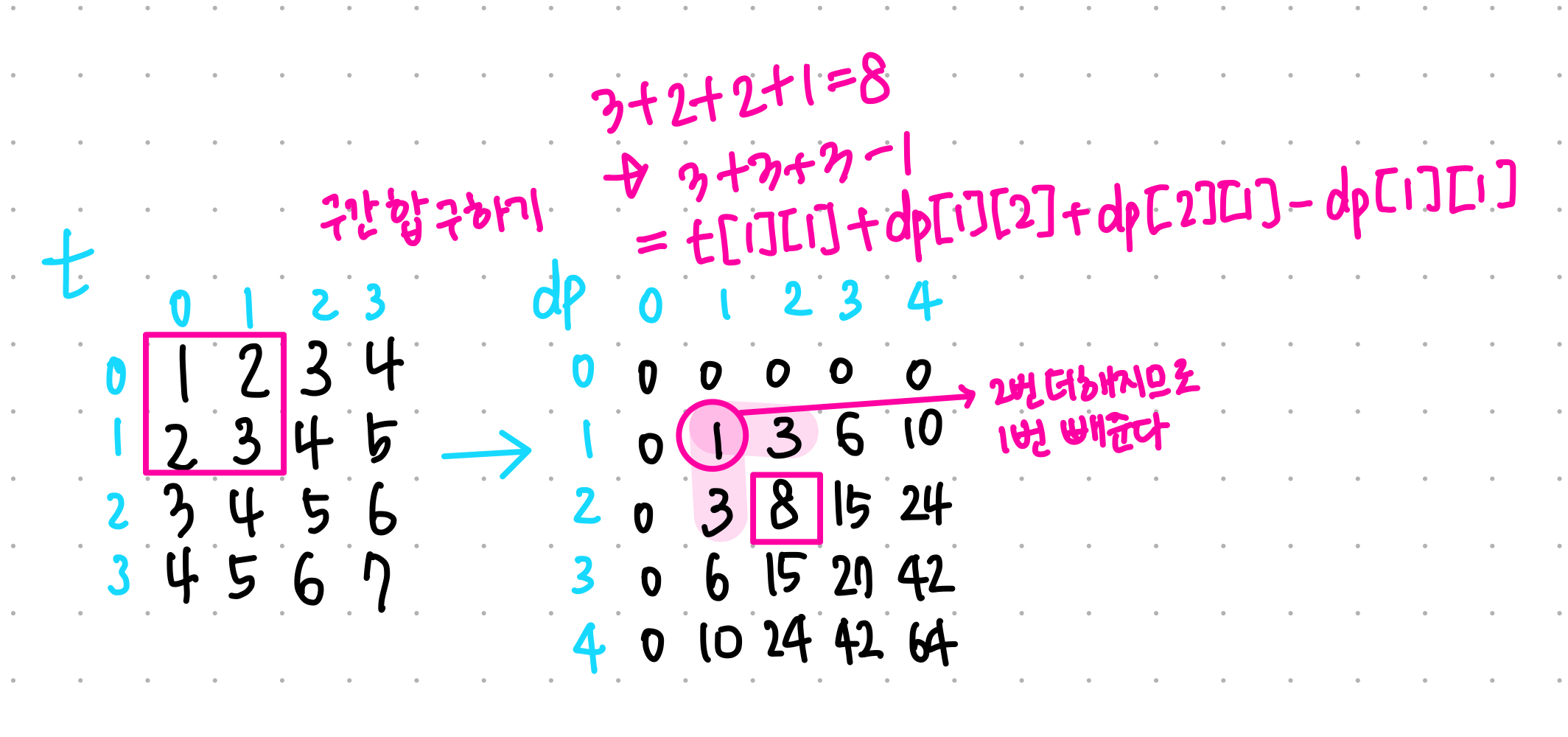 sum = dp[x2][y2] - dp[x1-1][y2] - dp[x2][y1-1] + dp[x1-1][y1-1]