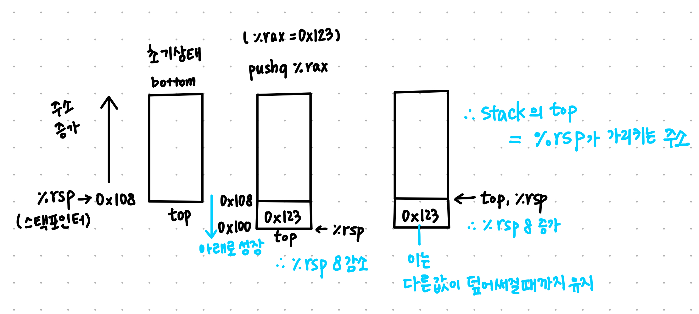 - 관습적으로 스택은 아래 방향으로 성장한다.