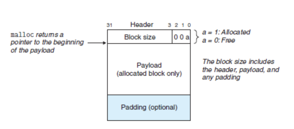 - Padding : optional, 외부 단편화를 극복하기 위한 할당기 전략 또는 정렬 요구사항을 만족하기 위해 사용