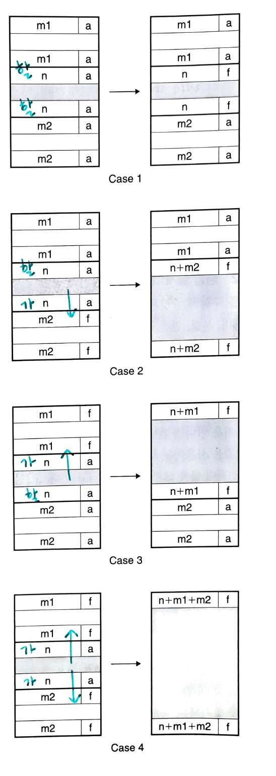 - 연결(Coalescing) : 인접 가용 블록들을 통합