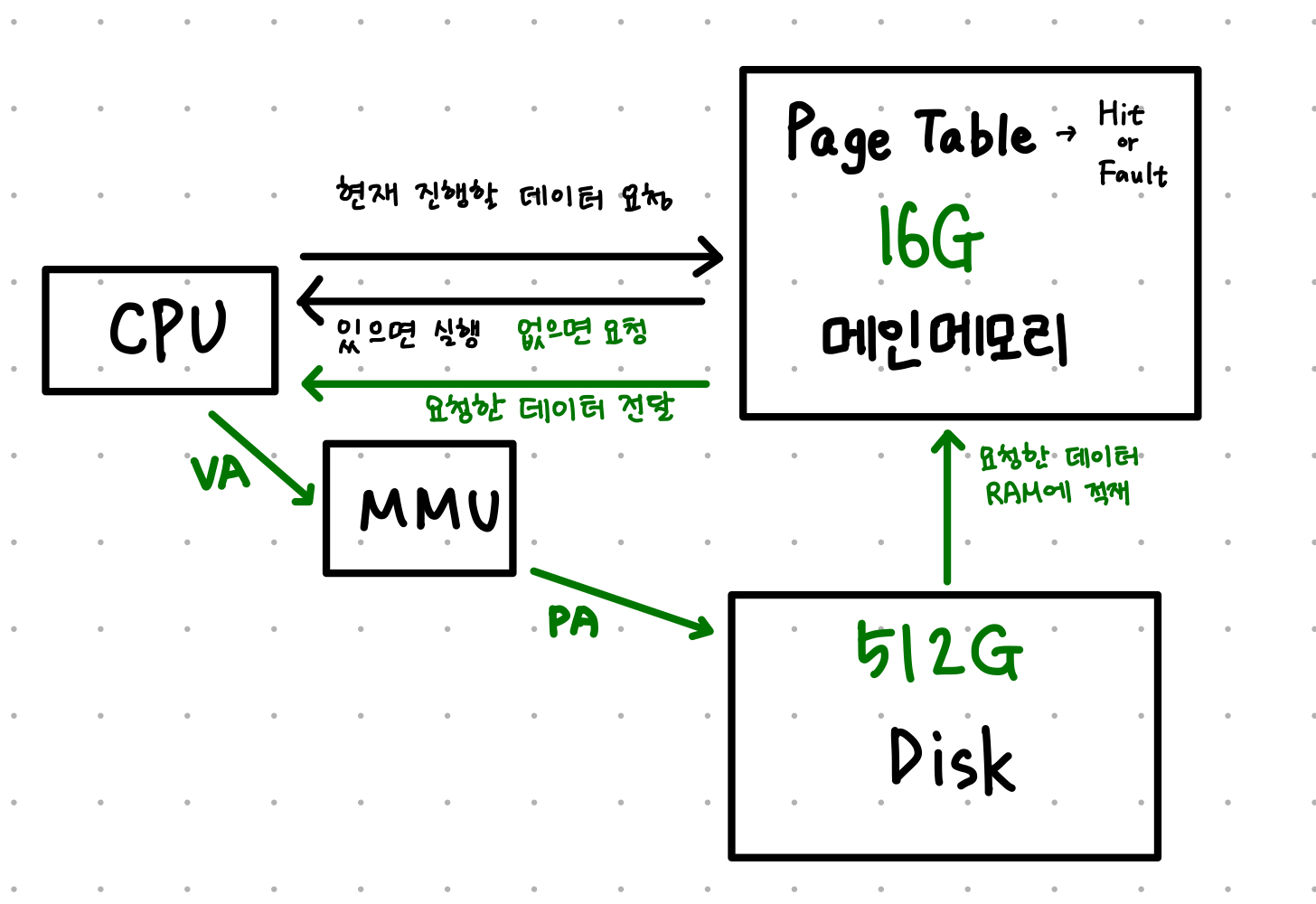 - 빠르고 작은 기억장치(RAM)을 크고 느린 기억장치(디스크)와 병합하여, 하나의 크고 빠른 기억장치(가상 메모리)처럼 동작!