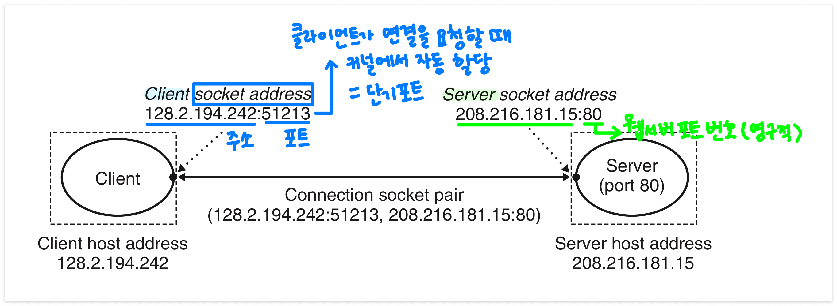 - 연결은 두 개의 종단점의 소켓 주소에 의해 유일하게 식별