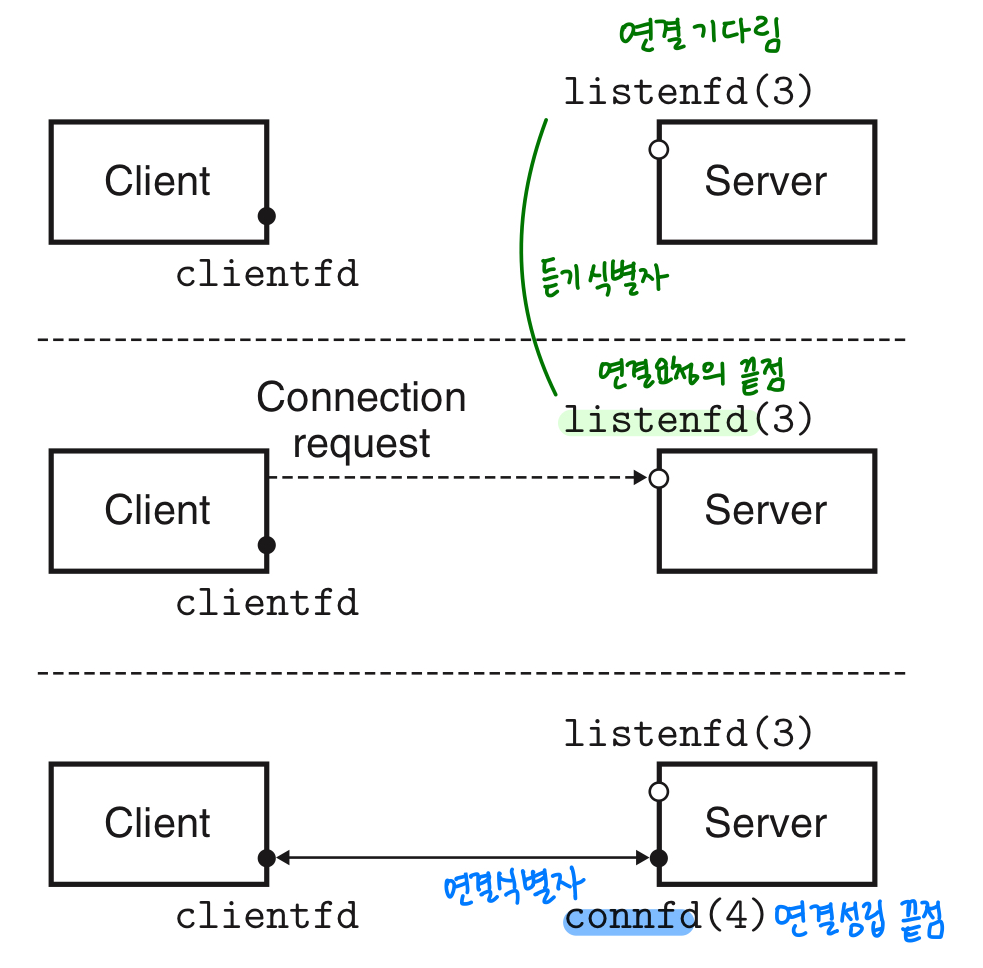 듣기 소켓 = 클라이언트로부터의 연결 요청을 수락할 수 있다.