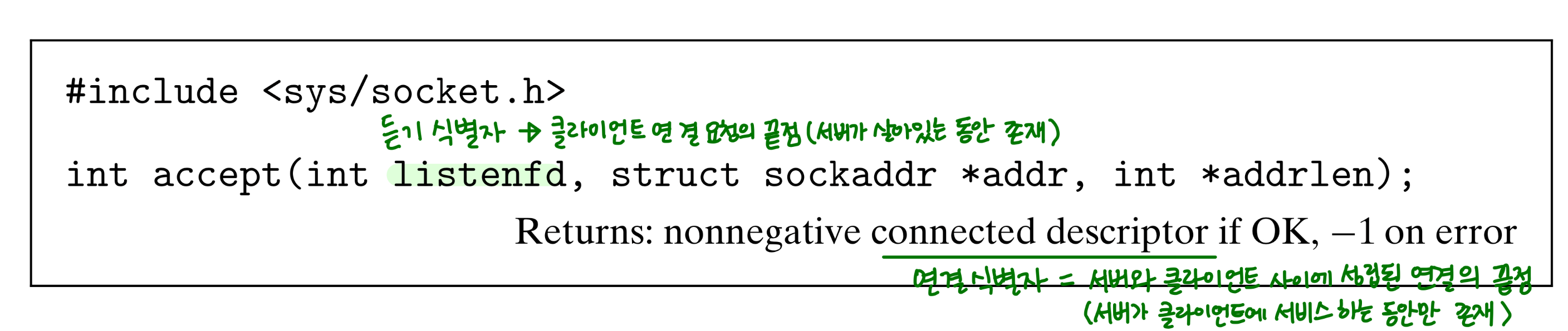 서버가 이 함수를 호출하여 클라이언트로부터 연결 요청을 기다린다.