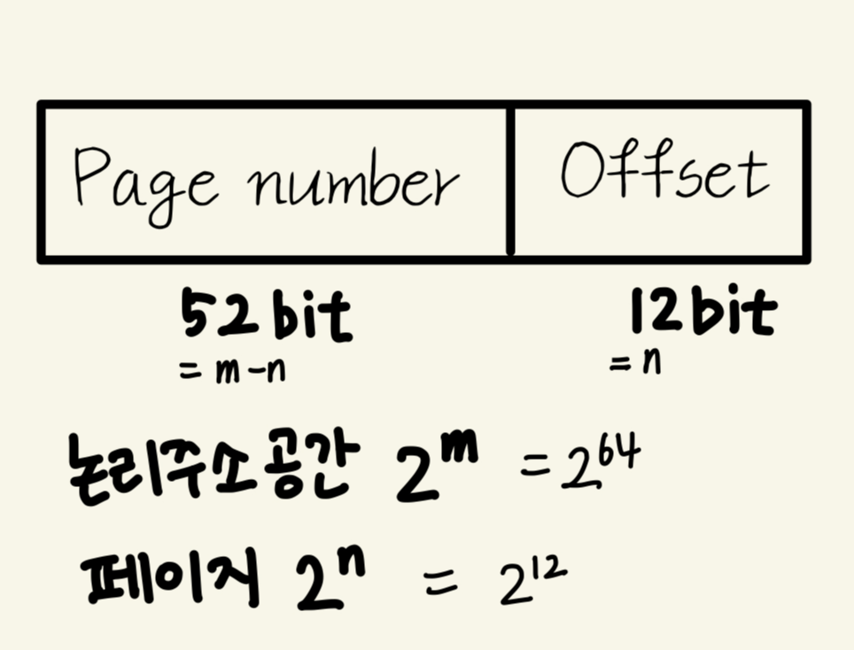- 상위 52bit = 페이지 테이블의 인덱스를 나타내는 데 사용 = page number