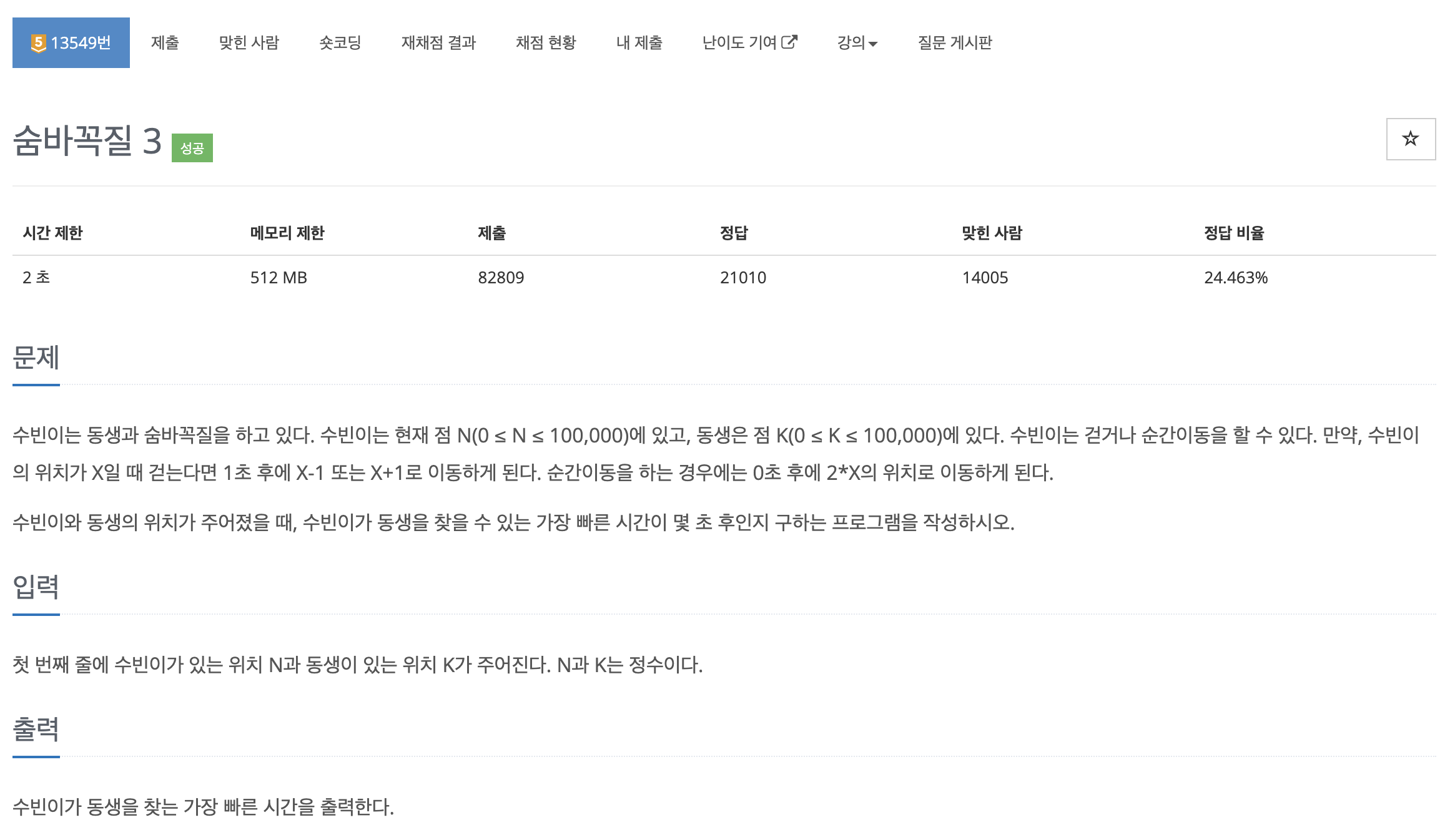 2. ํ์ฌ ์์น i์ +1, -1 *2 ํ ์์น์ ๋ํด ์ ์ฅ๋์ด ์๋ ์๊ฐ times[k]์ ๋๋ฌํ ์๊ฐ(times[i] + 1 ๋๋ times[i])์ ๋น๊ตํ์ฌ ๋๋ฌํ ์๊ฐ์ด ๋ ์์ผ๋ฉด times[k]๋ฅผ ๊ฐฑ์ ํ๋ค.